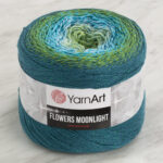 Yarnart Flowers Moonlight has self-transitioning marbled color options. It is a yarn blend of 53% organic cotton, 43% anti-pilling acrylic and 4% metallic polyester. It has a soft texture and is anti-pilling.